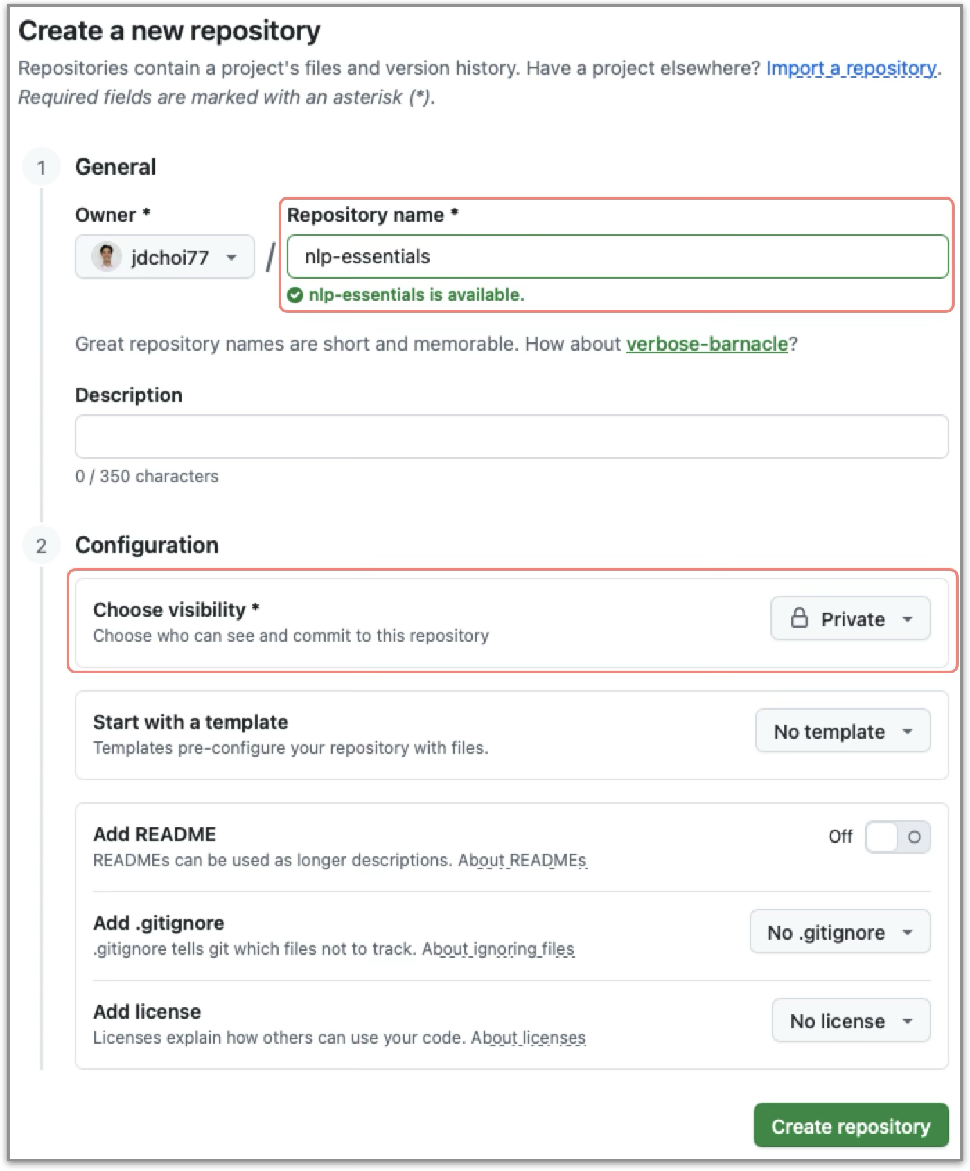 Create a new repository named "nlp-essentials" and set its visibility to Private.