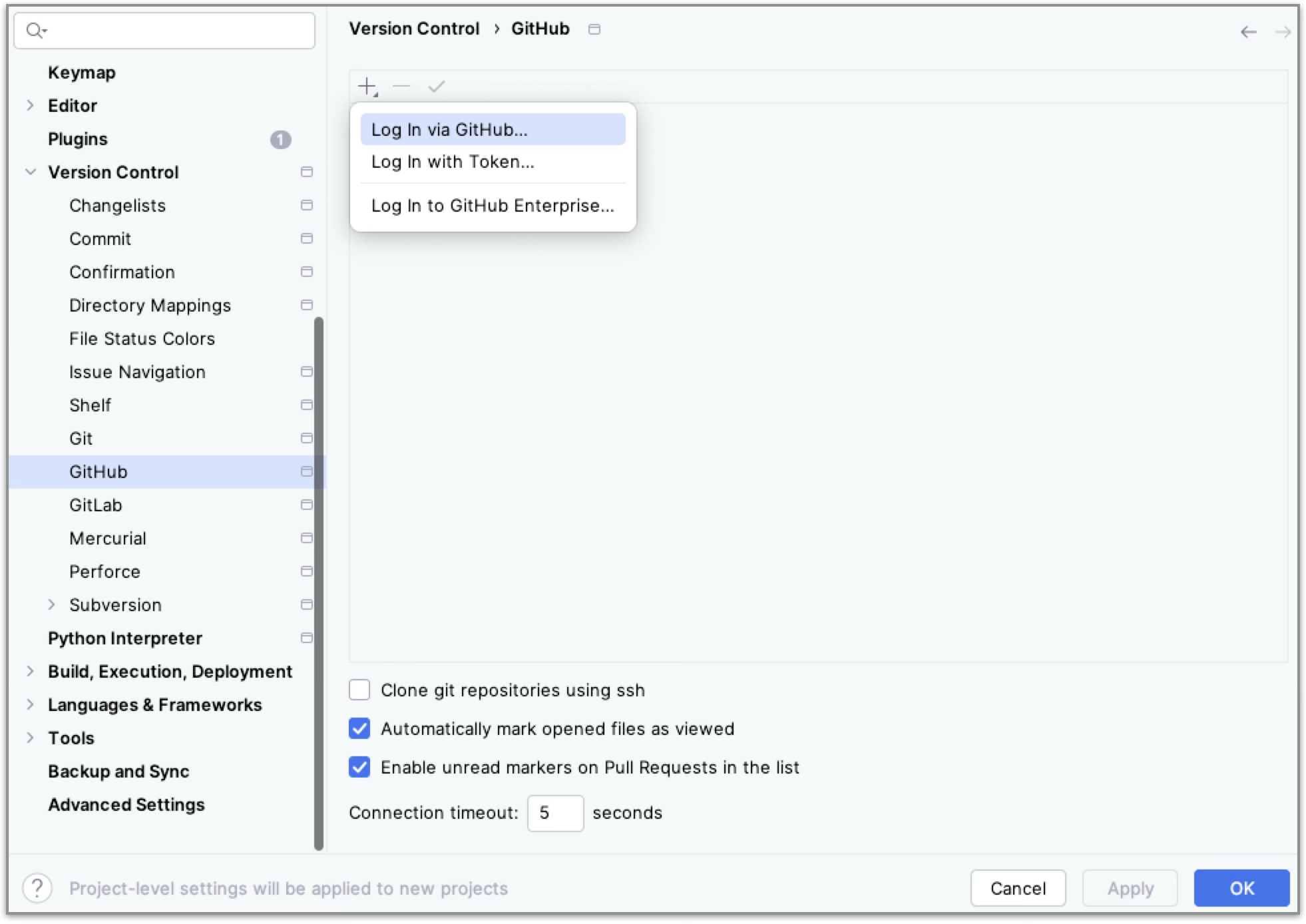 [Settings] > [Version Control] > [GitHub]. -