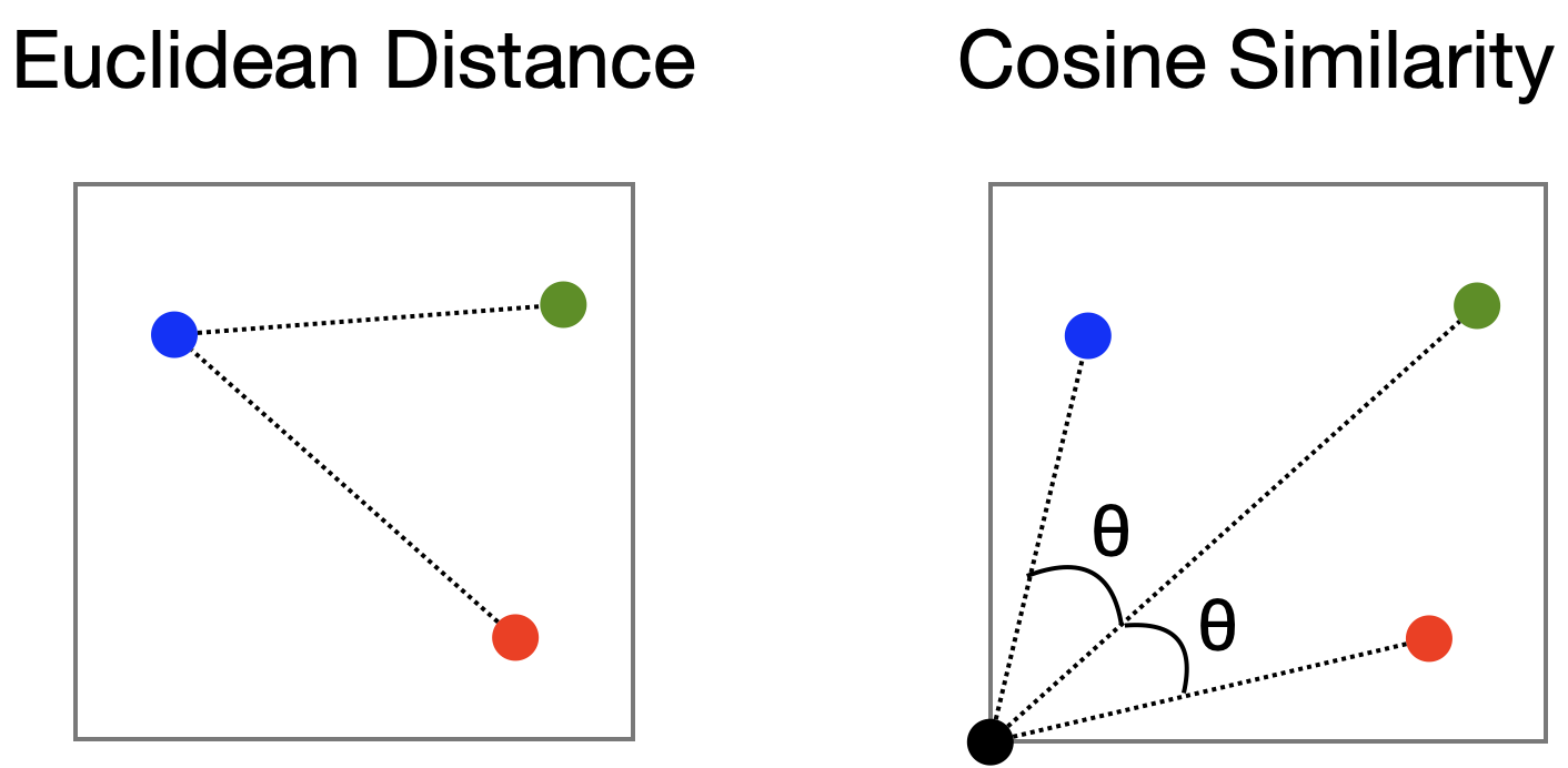 The following diagram illustrates the difference between the two metrics. The Euclidean distance measures the magnitude between two vectors, while the Cosine similarity measures their angle to the origin.